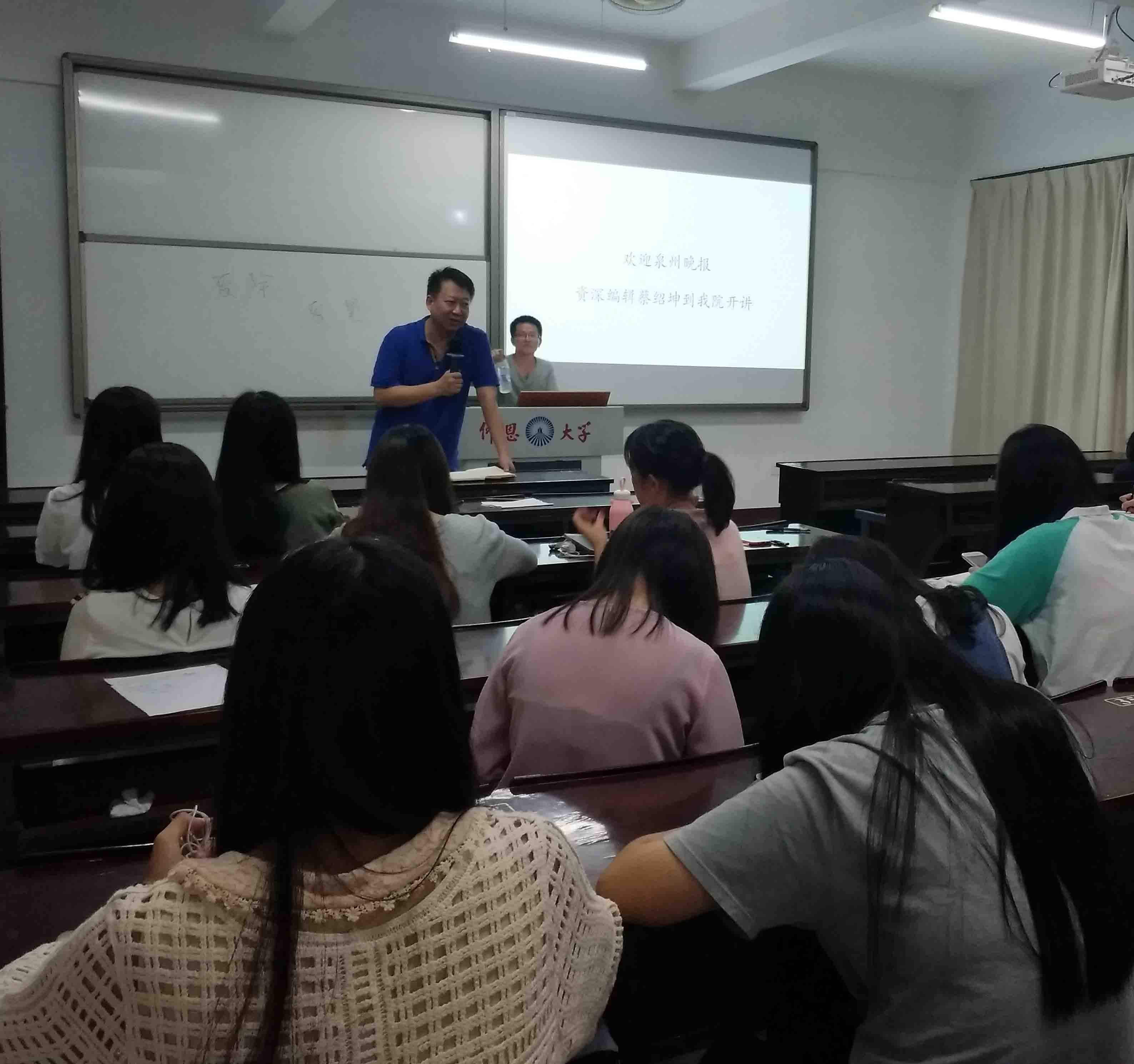 6月22日,beat365正版唯一官网必一业界老师,泉州市广播电台副台长,高级记者黄永超教授的开放课堂“新媒体导论”邀请泉州晚报资深编辑蔡绍坤老师为同学们讲解当下新媒体实战。按照beat365正版唯一官网必一业界导师开放课堂的要求,全校其他任何专业的感兴趣的同学都可以到第三教学区仰恩楼C4-305教室旁听。