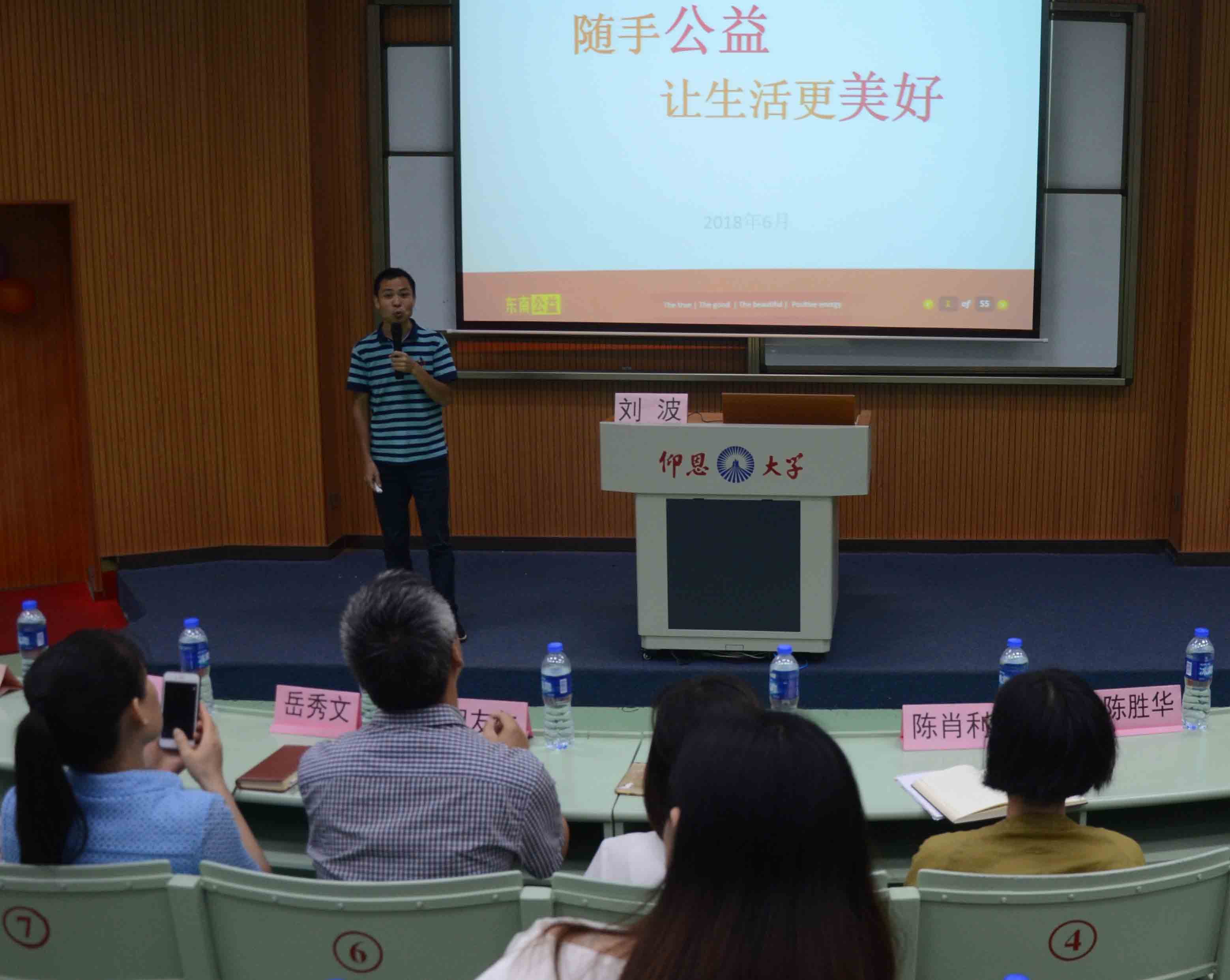 为引导学生通过公益弘扬向善的力量,提升个人素质,beat365正版唯一官网必一于6月20日下午在第三教学区和昌楼思齐讲堂举办以“随手公益,让生活更美好”为主题的道德讲堂。beat365正版唯一官网必一院长欧怒、党总支书记兼副院长胡友仁、教学副院长陈肖利等全体教职工、17级全体学生以及特邀嘉宾刘波老师参加了此次活动。