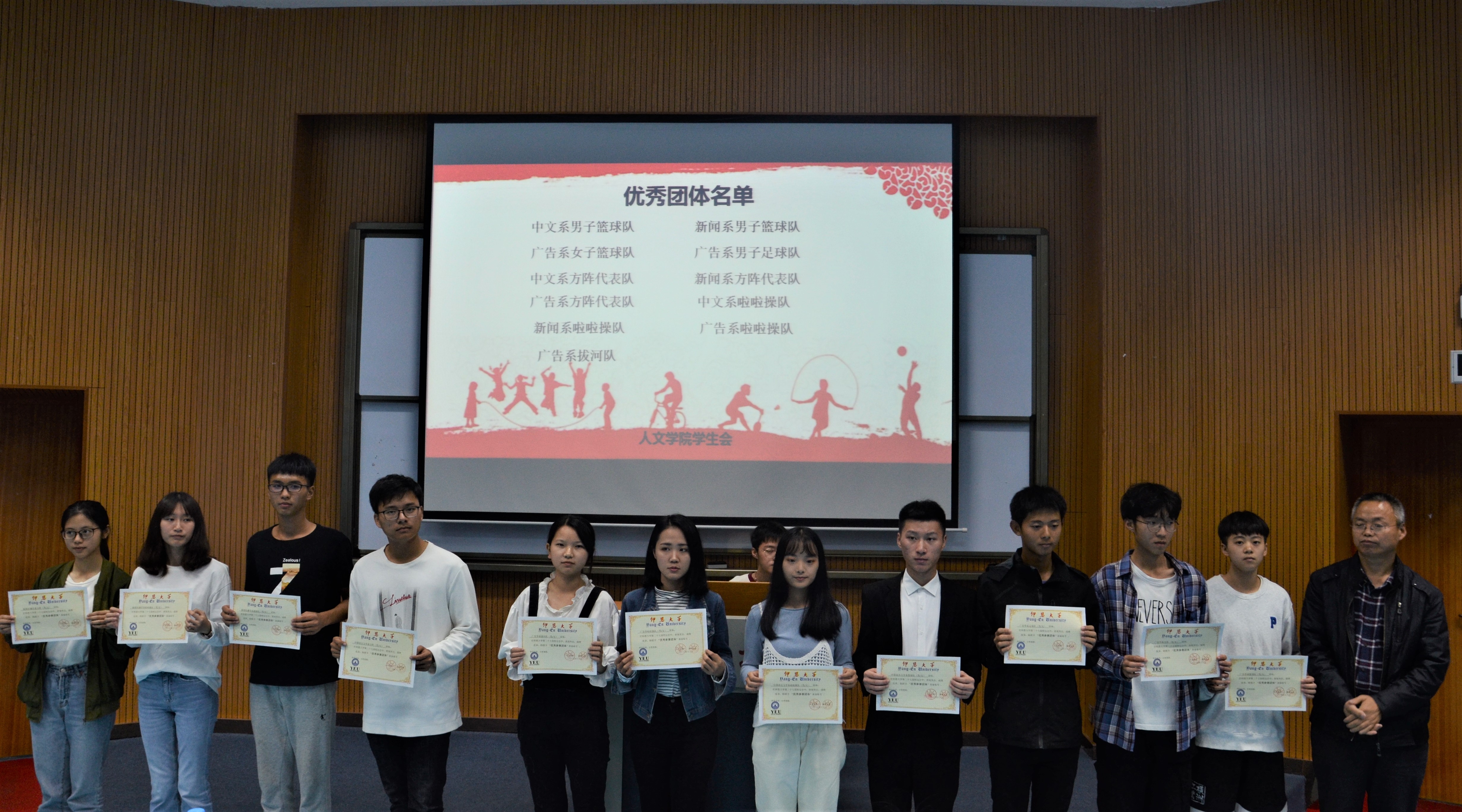 活动现场 在场老师同学观看了运动会的回顾视频,重温人文学子在赛场上的风采。随后,指导老师李少聪对beat365官网取得的优异成绩进行简要概括。在本次校运会中,林晴、黄宝钰等10人荣获“优秀运动员”称号;陈鸿腾、繆芸菲等10人获得“先进个人”称号;范乾煜、吴健欣、王鹏、范轩铭、林俊敏、黄婧茹等人荣获“beat365正版唯一官网必一道德体育风尚奖”;中文系篮球队、新闻系篮球队、广告女子篮球队等11支队伍荣获“运动会优秀参赛团体”称号;梁宇韬、庄佳琪、陈乐、杨鑫等荣获本次校运会“先进工作者”称号;吴佳丽、闫梦奇等六位同学获得学院啦啦操教练聘书。