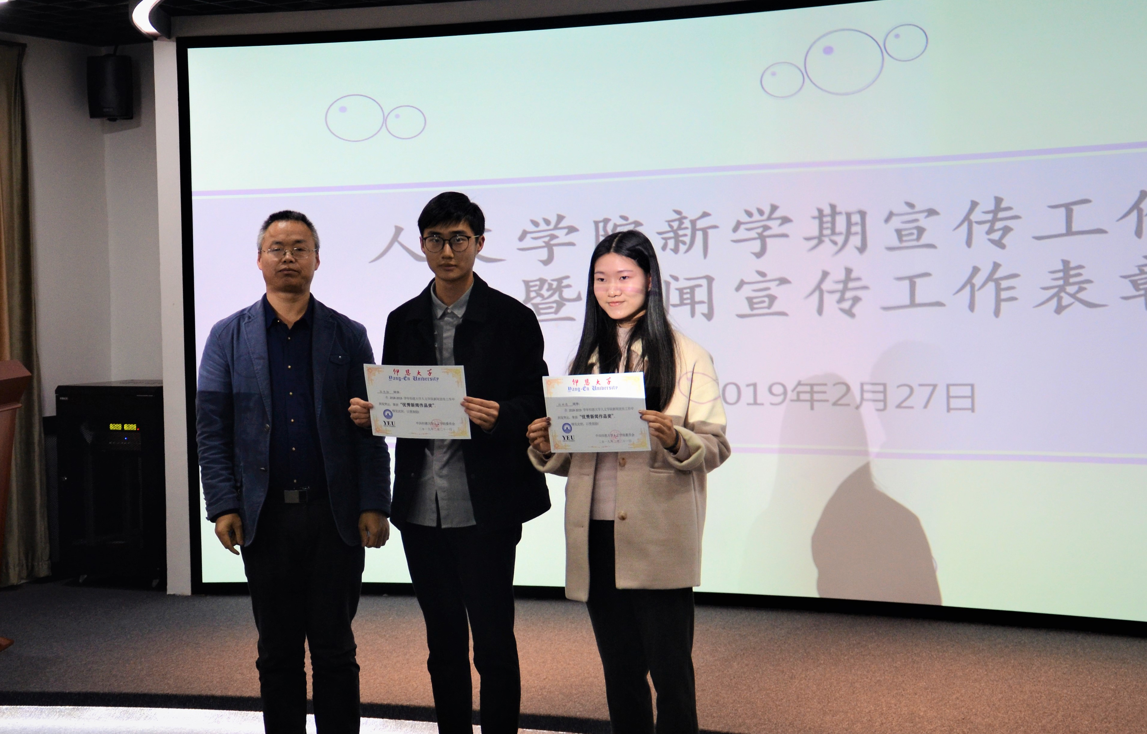 会议现场 在本次新闻宣传工作表彰中,谢梦、魏梦婷荣获特别贡献奖;马贤颖、吴艳梅、林静琦、尤小红荣获优秀记者奖;梅佳欣、沈宇杉、张舒淇、雷林梅荣获优秀编辑奖;郑雅婷、陈俊翔荣获优秀新闻作品奖,胡友仁书记为获奖同学颁奖。