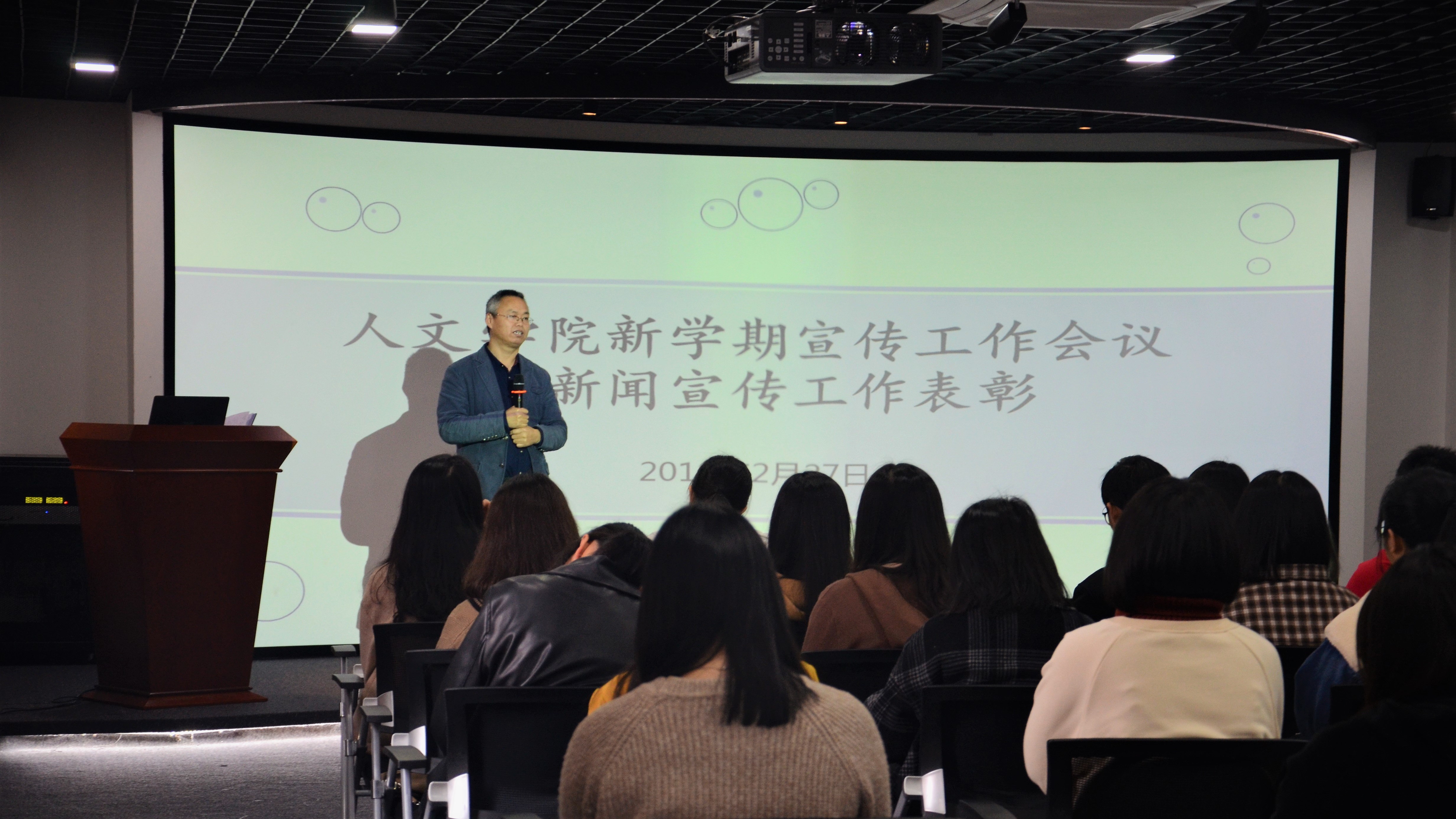 2月27日下午,beat365正版唯一官网必一新学期宣传工作会议暨新闻宣传工作表彰大会在普照楼虚拟仿真实验室召开。beat365正版唯一官网必一党总支书记兼副院长胡友仁、副书记刘巧玫、全院各班级宣传委员、团委、学生会宣传部门以及新媒体团队成员受邀参加本次大会。