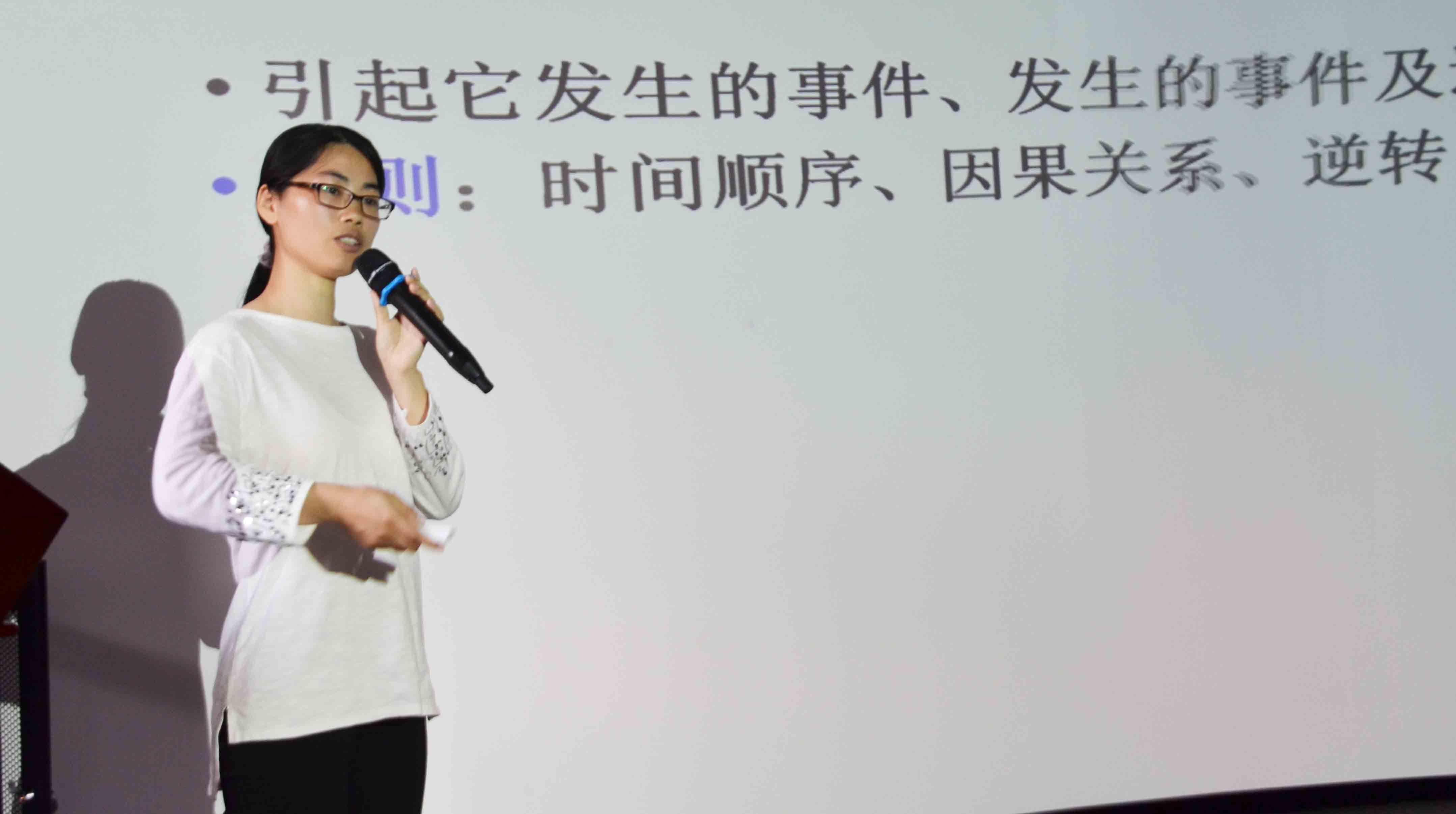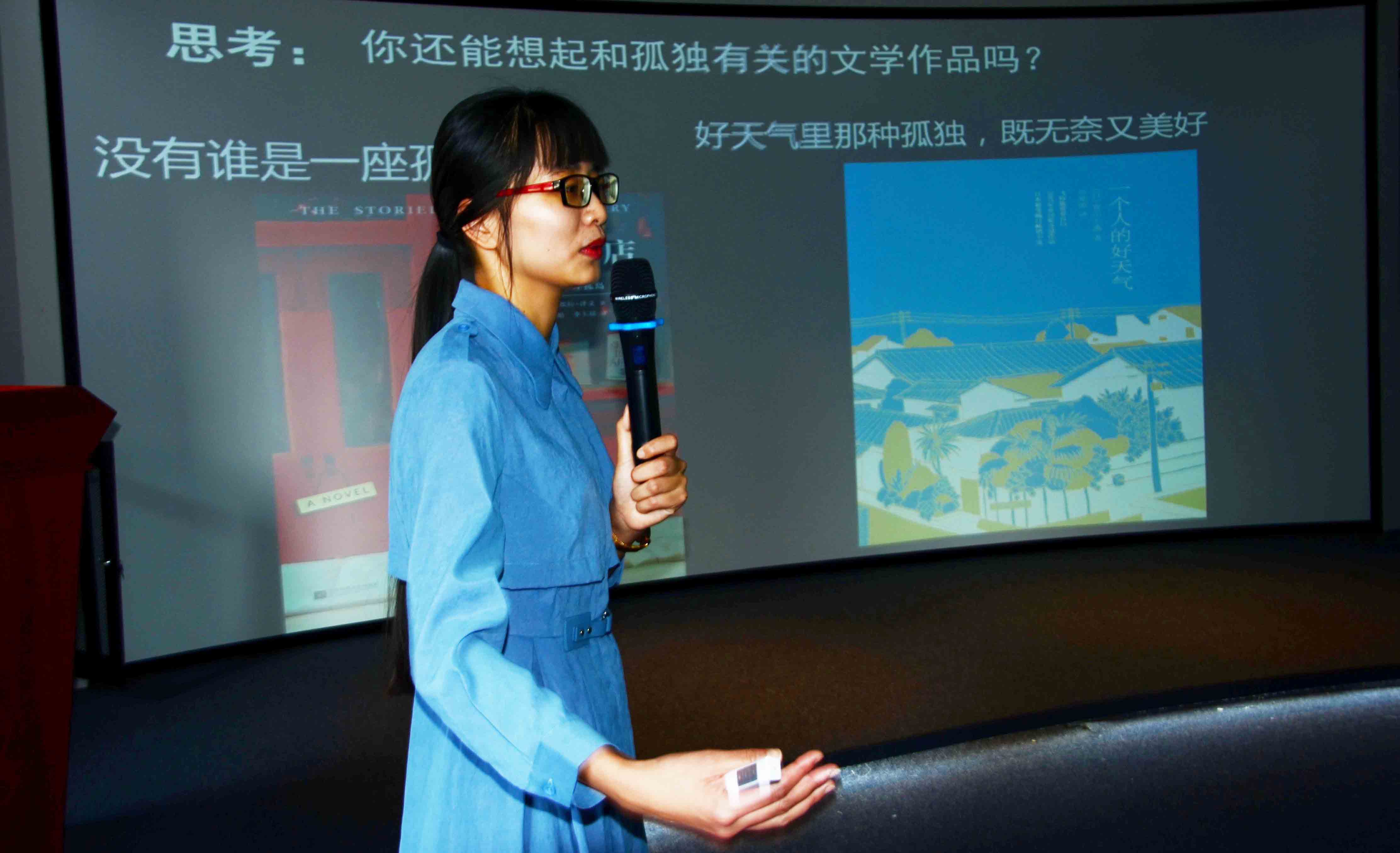 比赛现场 比赛在何丹丹老师的莎士比亚的十四行诗解读中拉开序幕,他带领着我们走进美丽的诗歌国度中。紧接着,张婧雅老师通过大家耳熟能详的咏史诗导入,结合文献分析了左思“创成一体,垂式千秋”的咏史诗。程燕婷老师则是以“孤独”这个永恒的主题开篇,从表层意思和深层意义两个方面鉴赏马尔克斯的《百年孤独》。岳秀文老师通过六种音变类别和音变的规则给大家讲解“啊”的音变。李清霞老师则围绕“何为文化”让我们了解中国文化概论这门课程。最后,林珍华老师通过文体解析和故事材质两个方面讲解故事写作的要领。