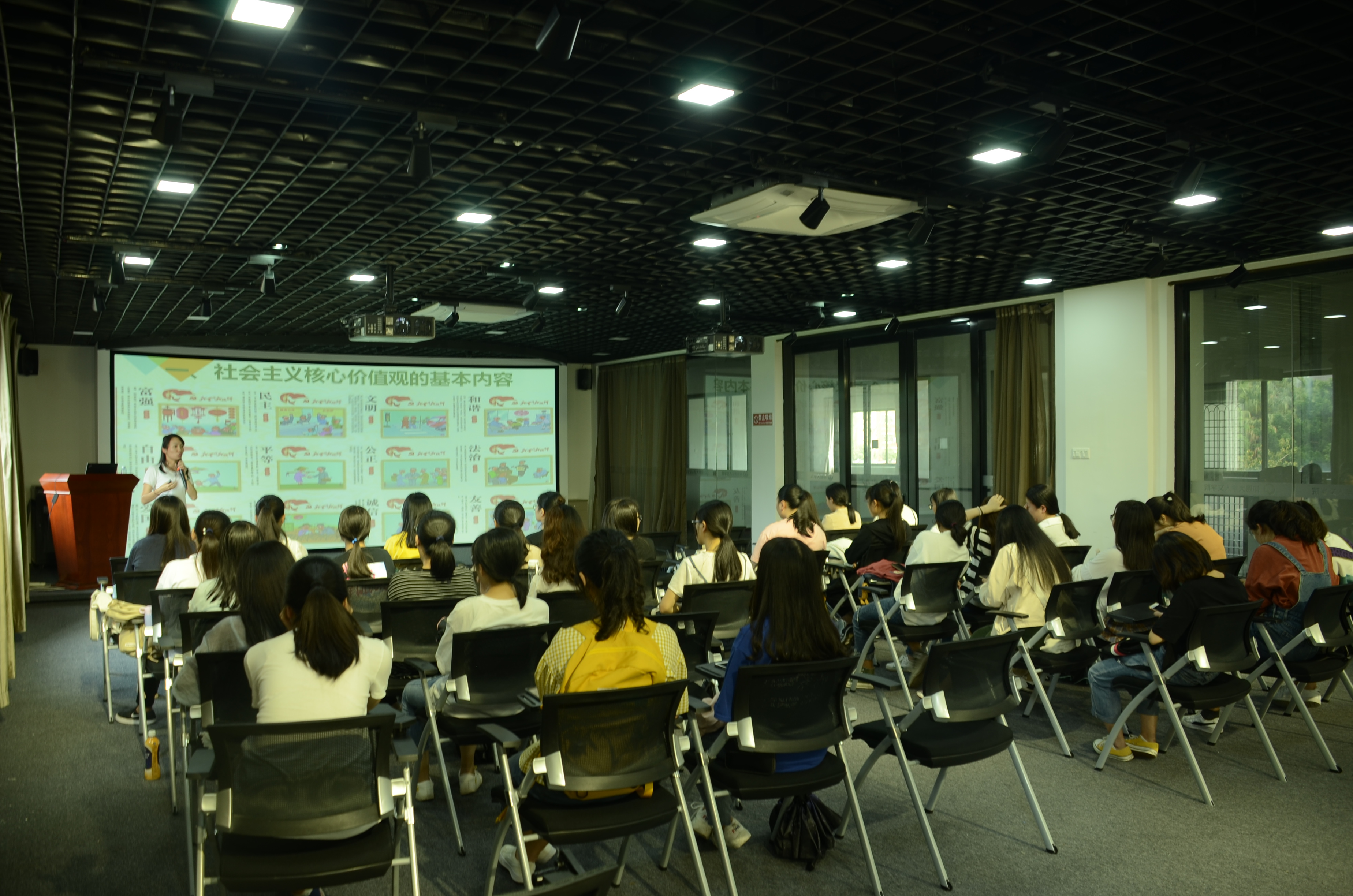 宣讲活动现场 宣讲从三个部分深入阐述了社会主义核心价值观以及文化自信对于国家、民族、个人的重要性,“扣好人生的第一粒扣子,明确自己从哪里来,往哪里去,追求的是什么”许淑琴以自己的独到见解辅以通俗易懂的例子,深入浅出,启迪着共青团员们树立正确的价值观。她强调,青年的价值观不仅关系到个人的发展前途,更关系到社会的价值取向,关系到国家的未来,广大共青团员要拿出自己的责任担当,在日常的学习生活中认真践行“八字要求”,勤学、修德、明辨、笃实。