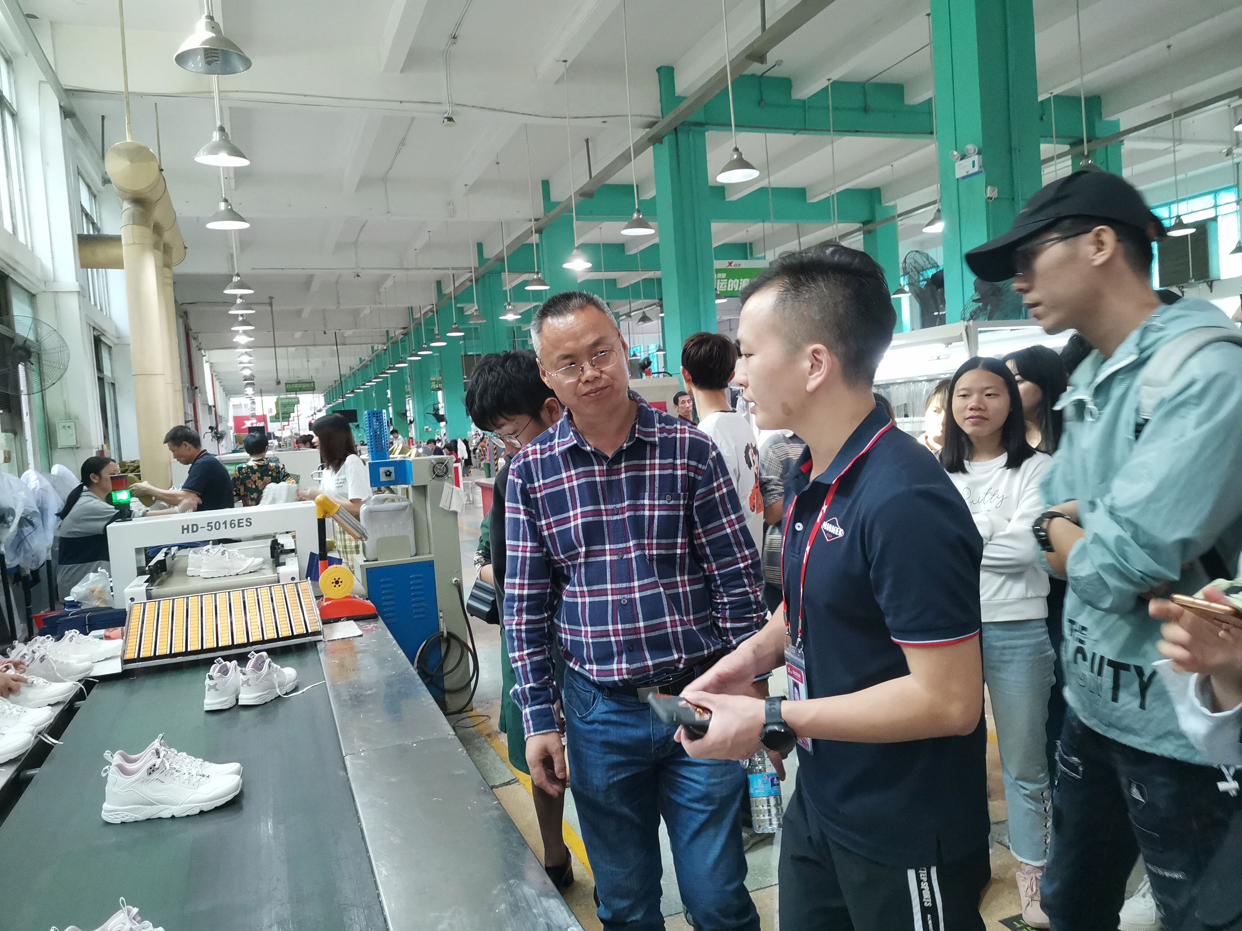 我们首先参观了特步生产车间。特步公共关系部吴明海部长热心为我们讲解。我们熟悉了产品从生产到装箱的全过程。一双鞋子经过68个工序,就可以成型出厂。车间拥有45条国际领先的针车流水线,12条成型流水线。车间工作人员精益求精一丝不苟,确保各个环节生产质量。通过观看生产线,我们对产品的生产流程与质量管理留下了极为深刻的印象。
