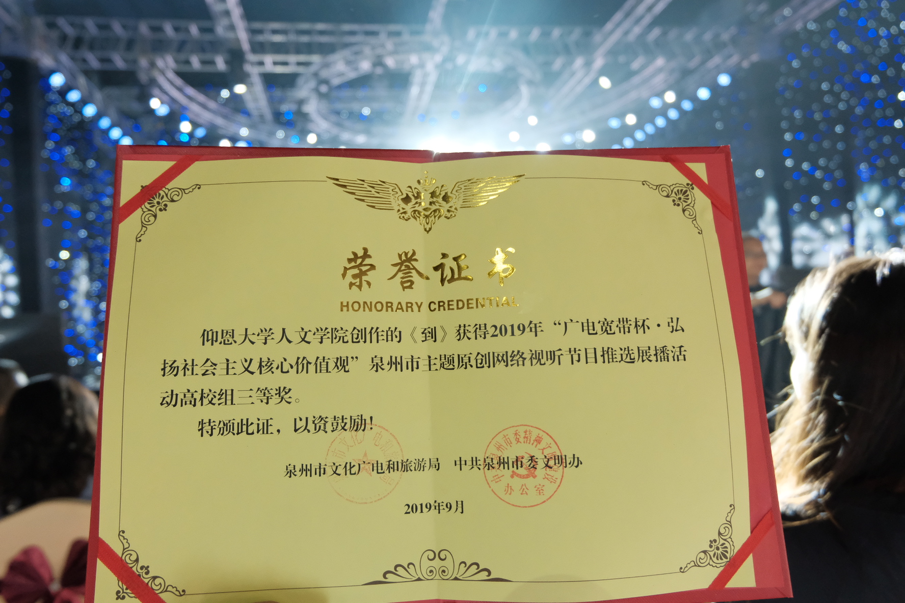 12月26日下午,beat365正版唯一官网必一和电视台选送的原创作品《到》《传城人》在2019年“广电宽带杯·弘扬社会主义核心价值观”泉州市主题原创网络视听节目推选展播活动中荣获高校组三等奖。
