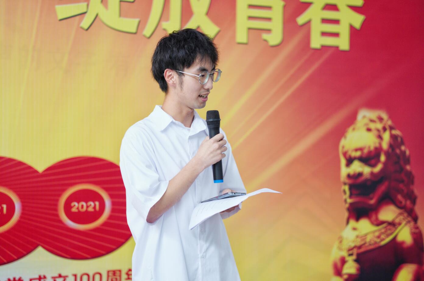“红船逆浪筹理想,举帜前行扬远航。”“中华振臂唤强音,五岳长征照路明。”“我淌过大海无边,铺起大桥通两岸,我冲破层叠大气,遨游于浩瀚太空。”一句句气韵雄浑的诗文中蕴含着耳熟能详的红色历史故事,再现了中国共产党领导人民从胜利走向辉煌的百年征程。《百年》、《百年峥嵘》、《星火燎原,理想照耀中华》、《百年礼赞》、《红》、《忆百年•当立时》等一首首原创诗歌,在朗诵者或婉转低回,或气势磅礴的精彩演绎下,深情传递着人文学子对党的热爱,对革命先烈的缅怀。