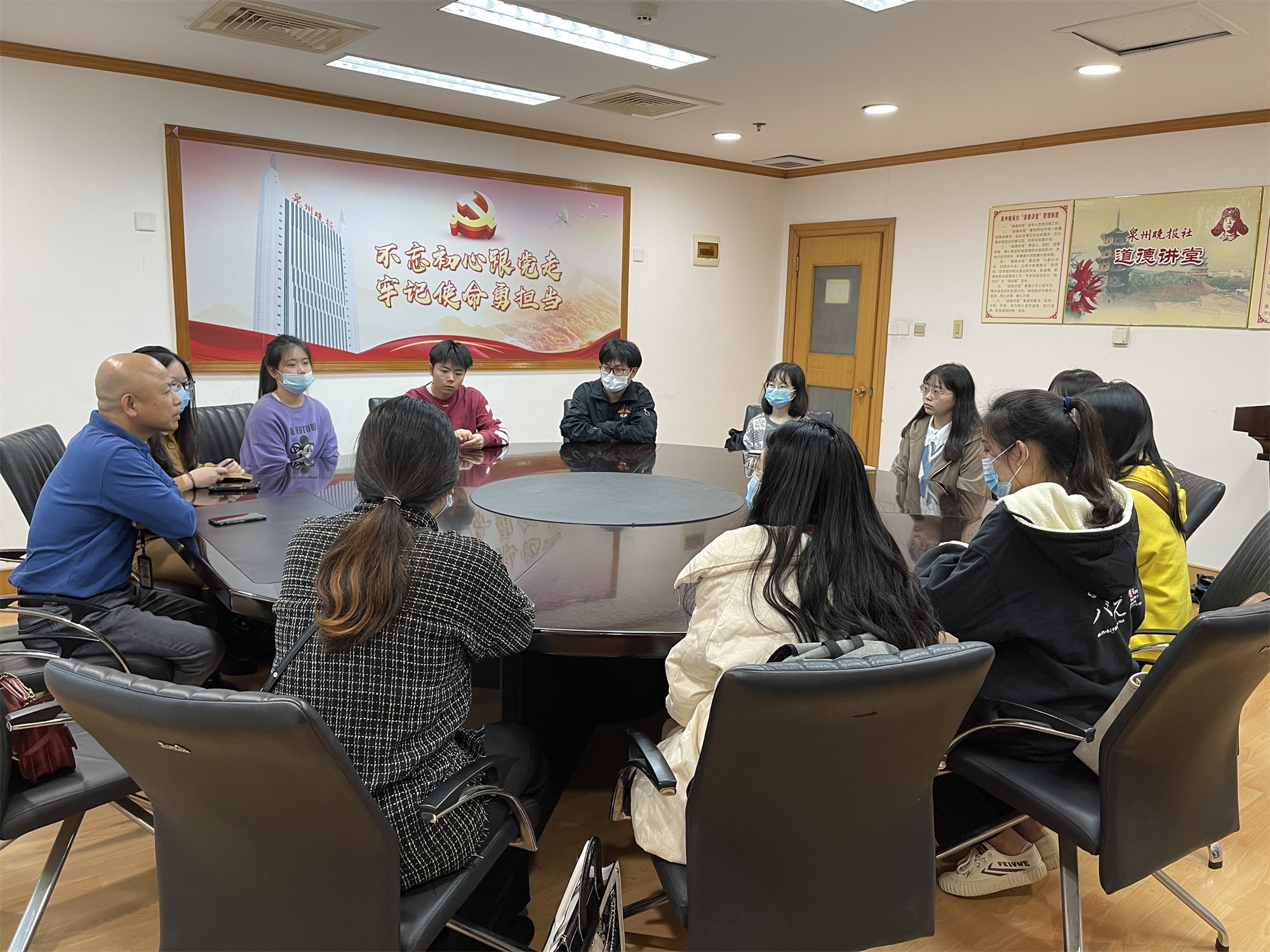 王家声还带领实习学生前往报社新媒体中心参观学习,新媒体中心主任苏智峰向同学们介绍了泉州晚报的新媒体矩阵、新闻大数据服务平台、舆情监测平台、移动直播、微视频等新媒体设备和应用系统,并建议同学们关注未来传媒和智能传媒。