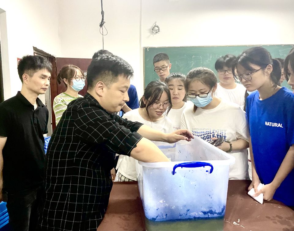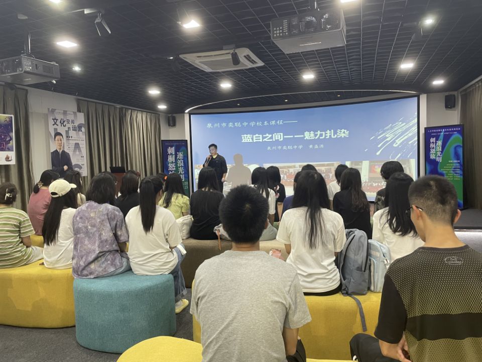 6月19日晚上于普照楼228,beat365正版唯一官网必一邀请外聘教师苏一森为beat365官网20级文创班同学开展“蓝白之间——魅力扎染”非遗文化教学活动。