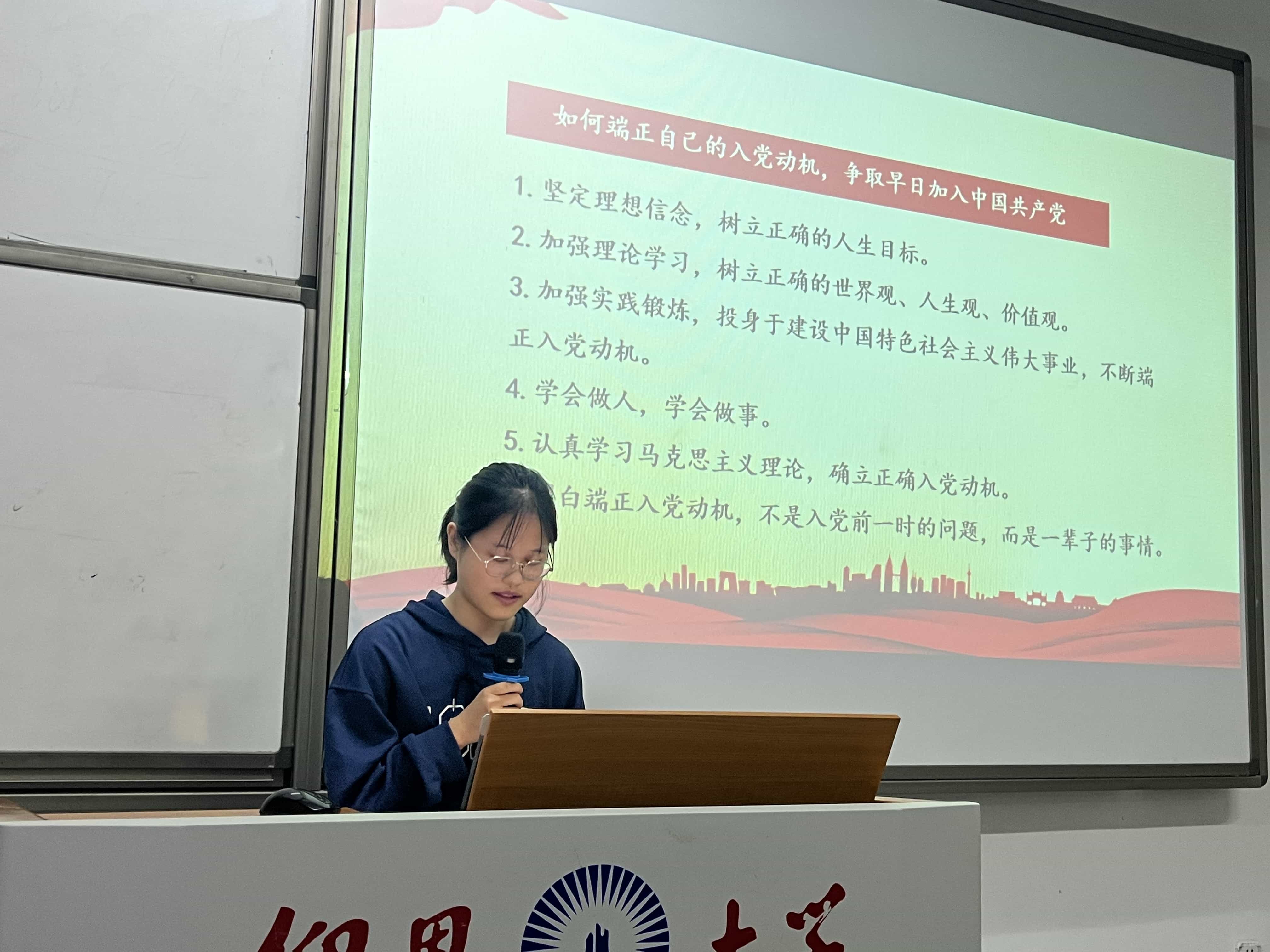 入党积极分子汇报在校情况 紧接着,17名入党积极分子分别围绕入党动机、党性、先锋模范作用等关键词,轮流进行了对党课的心得分享,用丰富翔实的历史事例展开讲述自己对党的认识和感悟,自己如何树立正确的入党动机,坚定理想信念,严守纪律规矩,增强宗旨意识,勇于担当作为,在群众中发挥发挥带头、骨干、桥梁的先锋模范作用,做一名合格的共产党员。