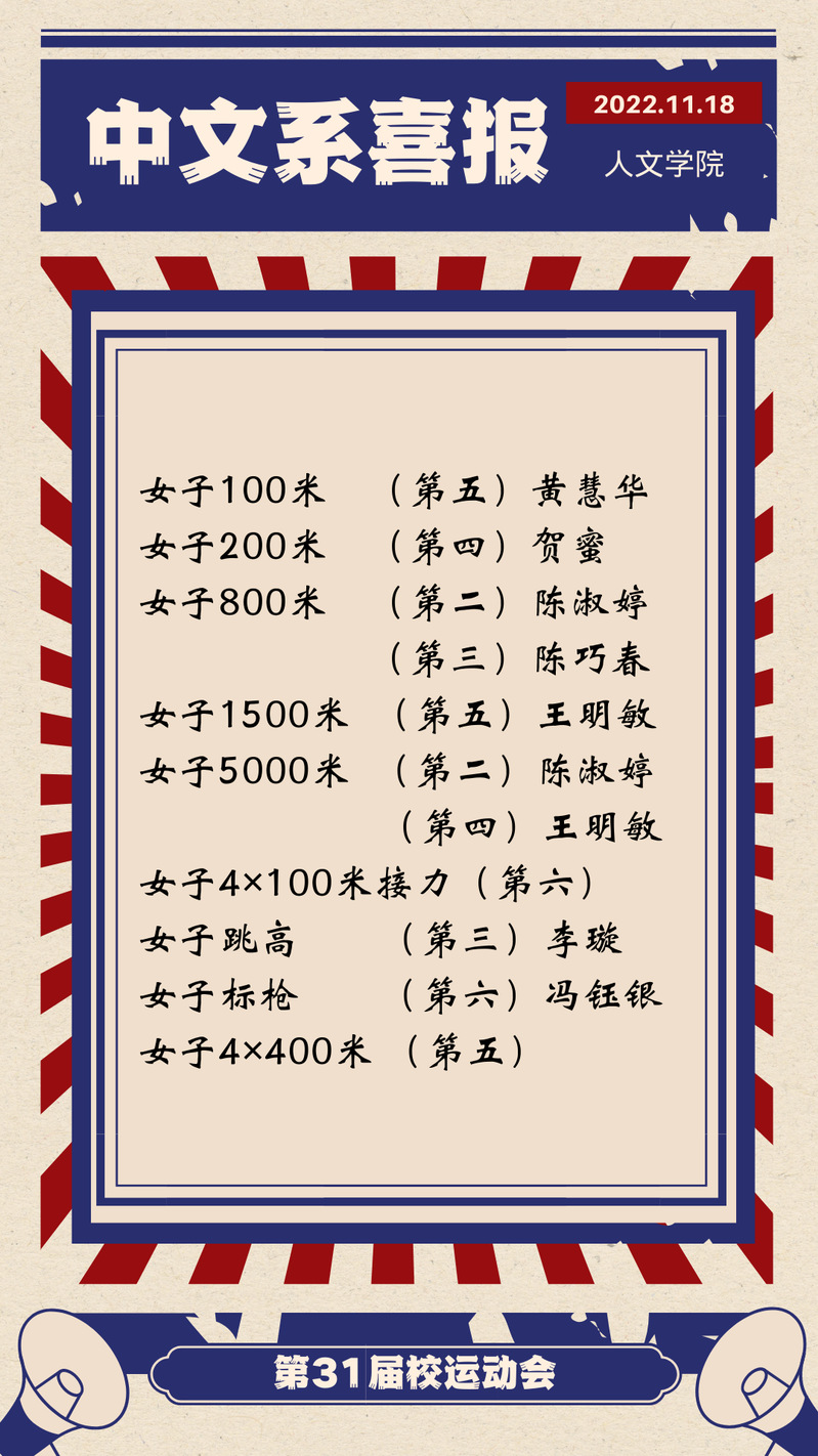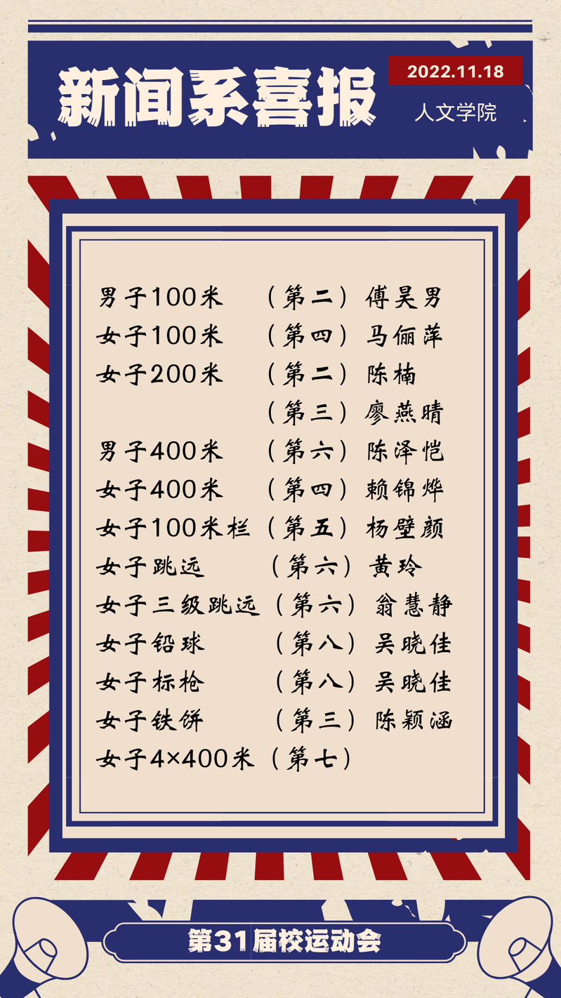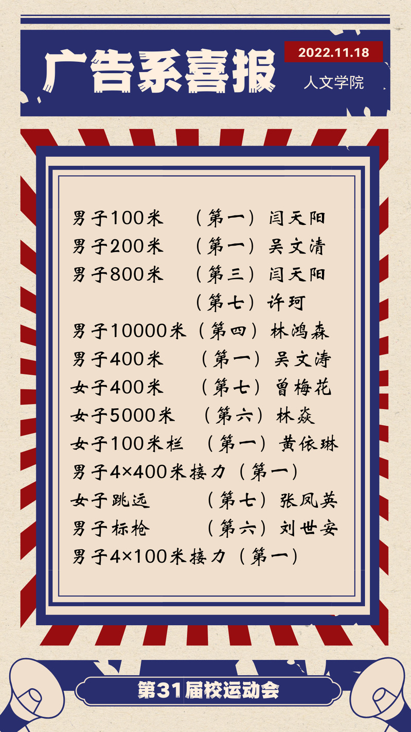 此次校运会,我们见证了人文学子的飒爽英姿和卓越风采,短短两天的时间里,我们看到了人文学子奋勇争先、也看到了各个班级齐心协力。在方阵中,中文系与广告系获得了优秀方阵;在团体赛中,广告系获得跳长绳比赛的第八名与排球比赛的第六名,新闻系获得排球比赛的第八名;在啦啦操比赛上中文系、广告系、新闻系分别获得了第五名、第六名、第八名的好成绩;在其他项目的比赛中,中文系、新闻系和广告系都取得了优异的成绩。