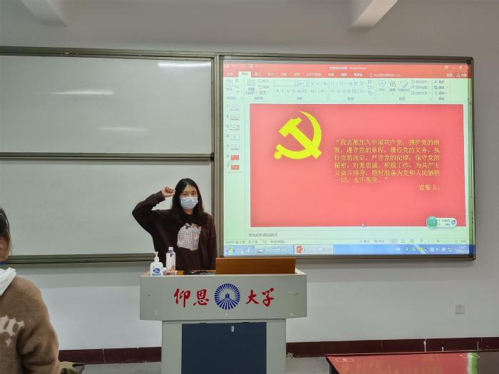在最后,支部书记戴舒容带领大家进行入党宣誓。通过入党宣誓,更加坚定了同学们的入党决心和信仰,同时也让同学们保持初心,不忘来时的路,砥砺前行,奋进新时代。蔡瑜佳/文图)