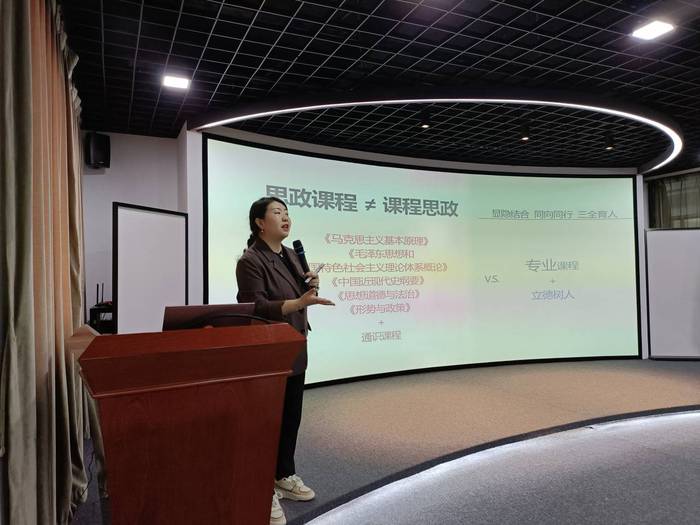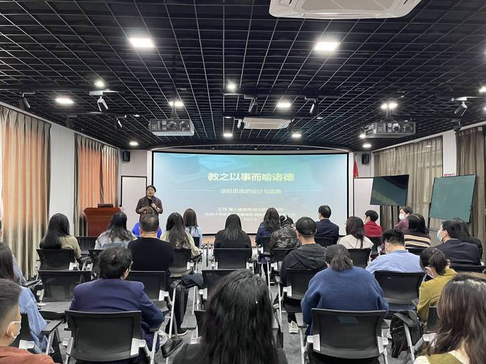 讲座中,王祎分别从“我所理解的思政课程”“课程思政需要哪些准备”以及“课程思政的设计与实践”三个方面进行分享。提出专业引领、先内化再传播及以身垂范的课程思政设计与实施思路,并指出:思政课程不等于课程思政,课程思政需要充分的知识储备、良好的政策敏感以及对行业前沿的充分了解。要求教师立足专业挖掘元素,课程思政的案例利用要找准切入点,“要软文不要硬广”,学会用日常补充宏大叙事。