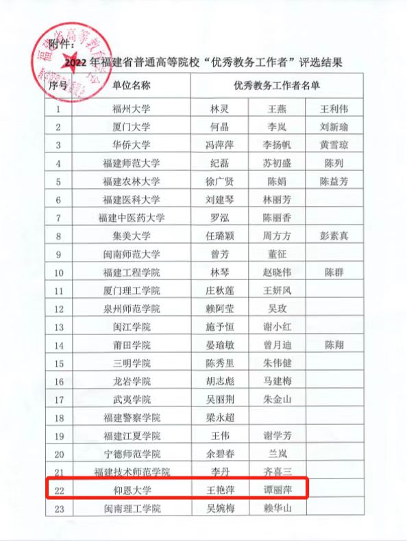 近日,福建省高等教育教学管理专业委员会根据《福建省高等教育学会教学管理专业委员会优秀教务工作者评选表彰办法》,采用电子邮件函评方式评选出2022年“优秀教务工作者”80名。此次评选结果公布,beat365正版唯一官网必一教务秘书谭丽萍名列其中。
