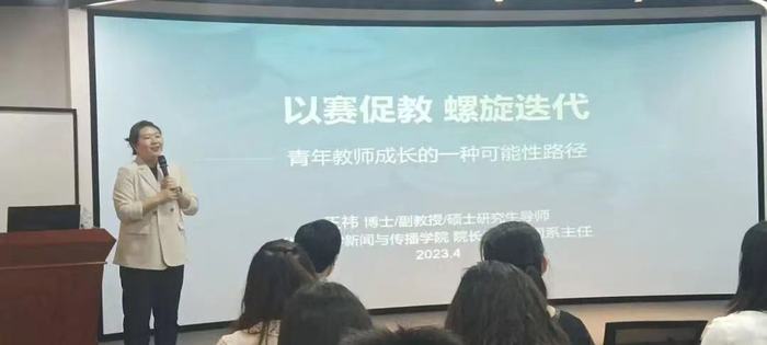 聚焦“以赛促教”这一观点,王祎提到教学竞赛不仅仅是为了让教师有学习的机会,更是要让教师通过开展科学研究、摸索和发现自己的潜能,从而自我实现和发展。通过比赛的形式,可以促进教师参与社会实践,积极参与社会调查,了解社会发展的趋势,从而更好地全方位发展自我,提升教学水平。同时,王祎还鼓励全体青年教师积极参加青教赛、教创赛,用比赛锻炼心态,磨练意志;推荐教师们多观看一流课程、课程思政示范课程,可以使教师们从中学习到优秀课程的精髓,应用到自我教学中,从而达到“从理论起点,发现课堂问题,再到解决问题,最后成效展示”的效果。