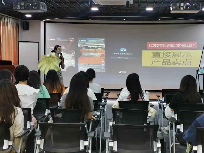 分享会上,蔡喃喃以“如何进行电商短视频营销”为主题,就“想不想拍好视频,想不想超越别人”这一激励话语作为开篇,开启了她的经验交流。蔡喃喃运用简单易懂的词汇将拍摄短视频的诀窍传授给同学们,通过各式各类的案例帮助同学们建立信心。