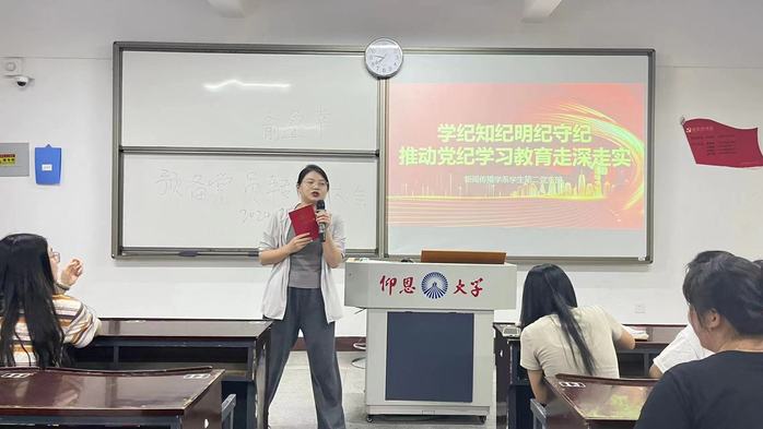6月20日下午,新闻传播学系学生第二党支部于普照楼202开展“学纪、知纪、明纪、守纪,推动党纪学习教育走深走实”党纪学习教育主题党课,支部书记吴萍萍主持本次党课,支部全体党员参与此次党课。