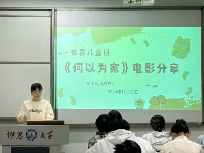 活动伊始,主持人简要介绍了世界儿童日的来历,阐述了本次活动的流程。随后,各队成员轮流上台进行电影海报的分享展示。一份份匠心独运的电影海报,带领在场的党员与积极分子踏入不同电影的“世界”,表现了仰恩学子浓厚的创新能力,以及关心爱护儿童的实际行动。