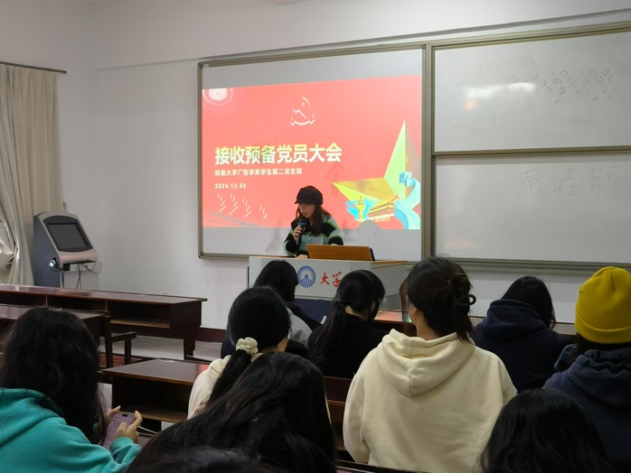 2024年12月9日,广告学系学生第二党支部在beat365正版唯一官网必一第三教学区普照楼309召开预备党员接收大会,本次会议由支部书记施晓渝同志主持,支部全体党员同志及发展对象参与此次会议。本次大会的主题是讨论是否接收黄垚颖同志为中共预备党员。