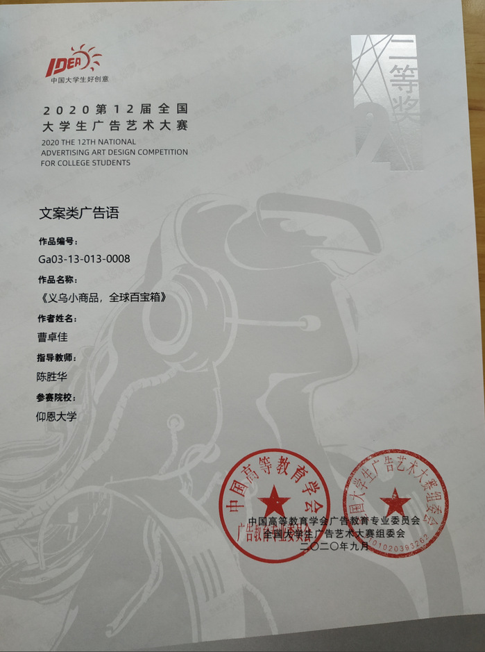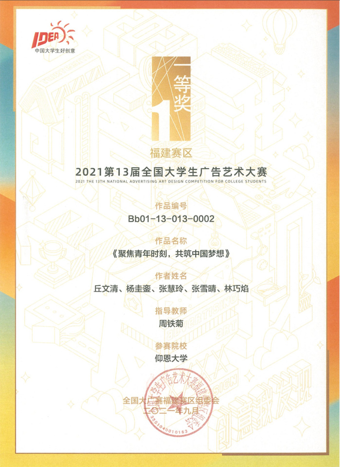 学院高度重视学生实践能力与创新精神培养,积极鼓励学子们参与各类赛事。新闻学专业学生在各类学科竞赛、创新创业项目中成绩斐然。近些年来,在新闻学专业教师组织指导下,学生参加全国大学生广告艺术大赛、“互联网+”大学生创新创业大赛等赛事,多次斩获国家级、省级奖项。在全国大学生广告艺术大赛中,新闻学子获得全国二等奖和三等奖各1项,省级一等奖多项,省级二、三等奖各几十项,2019级新闻学专业郑龙森同学获得2021年福建省“互联网+”大学生创新创业大赛高校主赛道的银奖。