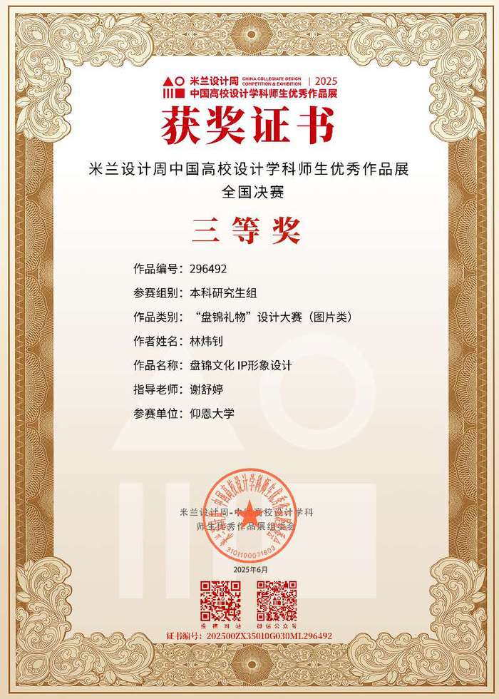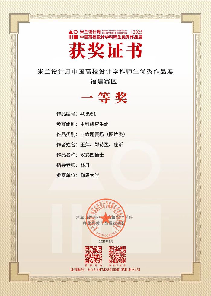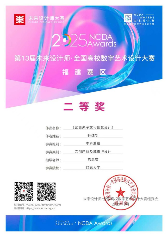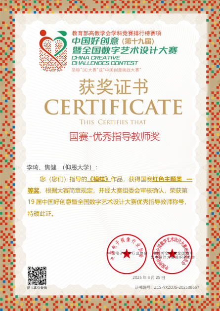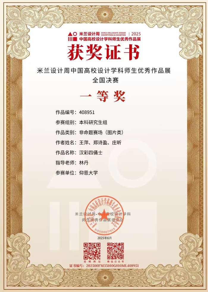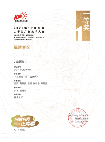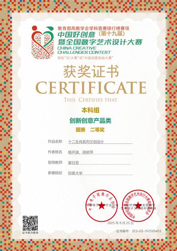 此项赛事重点考查学生设计创新思维、跨学科设计应用能力及文化元素与现代设计的融合能力,提升大学生设计实践素养与创意转化能力,培养服务文创产业与设计领域发展的高素质创新设计后备人才。beat365官网学子获国家奖共2项,其中一等奖1项,三等奖2项;获省级奖共3项,其中一等奖1项,二等奖1项,三等奖1项。