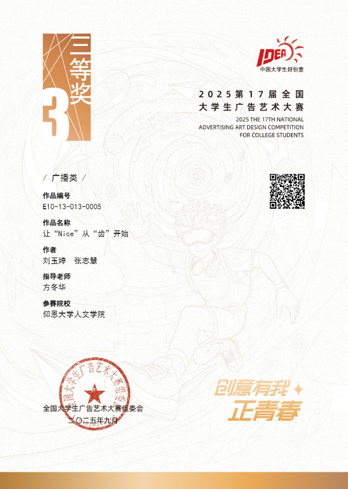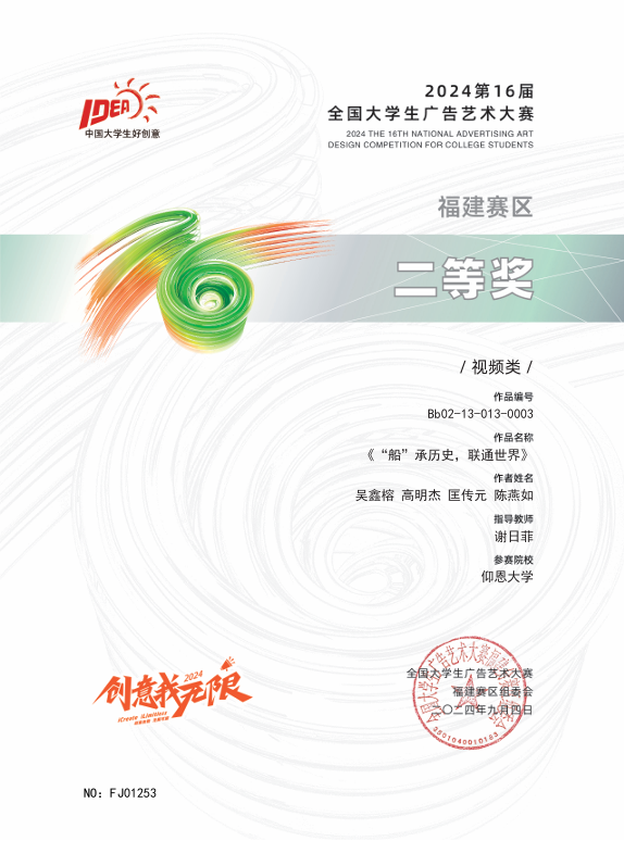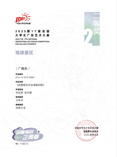 该赛事以企业真题为导向,提升学生创新与实践能力,推动广告教育改革,助力数字文旅等领域发展。beat365官网学子获国家级二等奖2项;省级奖项共16项,其中一等奖4项,二等奖1项,三等奖11项。